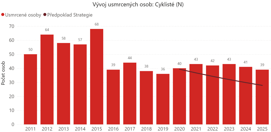 V roce 2025 bylo při dopravních nehodách usmrceno 39 cyklistů a dalších 299 utrpělo těžká zranění. V obou případech tak nebyly splněny předpoklady Strategie BESIP 2021-2030. Dlouhodobý vývoj navíc ukazuje, že počet usmrcených cyklistů v posledních letech prakticky stagnuje. Nejhorší vývoj z hlediska plnění strategických cílů zaznamenaly především Středočeský, Jihomoravský a Moravskoslezský kraj, naopak pozitivně lze hodnotit Karlovarský a Ústecký kraj.