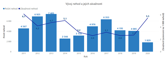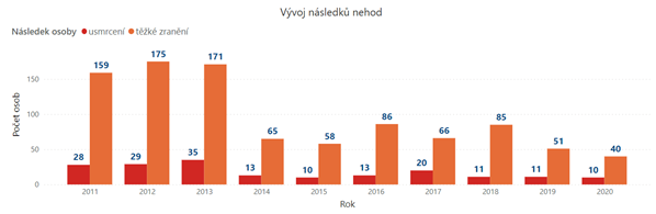 Z následujícího grafu je patrné, že rok 2020 navázal na pozitivní trend z posledních 7 let, kdy docházelo k výraznému poklesu závažných následků dopravních nehod způsobených vlivem námrazy, sněhu či náledí. Z grafu je zřejmé, že v roce 2020 došlo k nejmenšímu počtu závažných nehod. Naopak k největšímu počtu závažných nehod za celé sledované období došlo v roce 2013. Zmíněný pozitivní trend může být způsoben nárůstem teplot v nechladnějších měsících roku. Průměrná teplota vzduchu v prvních třech a posledních dvou měsících mezi lety 2011 a 2013 byla 0,64 °C. Naproti tomu průměr za stejné měsíce mezi lety 2014 až 2020 byl 2,14 °C.