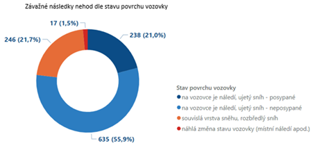 Z evidence PČR je zřejmé, že v období 2011-2020 docházelo nejčastěji k nehodám, když byl povrch vozovky ve stavu „náledí, ujetý sníh-neposypané“. Za tohoto stavu došlo k téměř 53 % veškerých nehod, které vznikly v důsledku vlivu námrazy, sněhu a náledí. Při této situaci došlo také k největšímu počtu úmrtí (98 ze 180) a těžkých zranění (537 z 956), což tvoří téměř 56 % veškerých závažných následků tohoto typu dopravních nehod. V případě kategorií „souvislá vrstva sněhu“ a „náledí, ujetý sníh – posypané“ došlo přibližně ke stejnému počtu nehod. Tyto nehody tvořily necelých 46 % všech nehod způsobených vlivem námrazy, sněhu a náledí. Při těchto nehodách bylo usmrceno 46 respektive 36 osob. Nejnižší četnost nehod a jejich vážných následků připadala na kategorii náhlá změna stavu vozovky. Za sledované období došlo pouze k 16 takovým nehodám. Nutno však podotknout, že při nich zemřelo 5 osob a 12 bylo zraněno těžce.