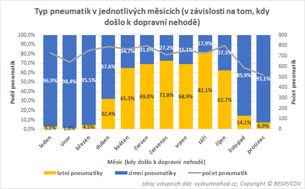 Dle datové základny Hloubkové analýzy dopravních nehod používá poměrně velké množství řidičů zimní pneumatiky celoročně (průměrně cca 30 %). Velmi často dochází také k tzv. „dojíždění“ pneumatik (pneumatika odpovídá požadavkům na hloubku hlavní dezénové drážky pro letní měsíce). Zimní pneumatiky mají ovšem jiné složení směsi než pneumatiky letní, tudíž nemusí být svými jízdními vlastnostmi pro používání v letních měsících a ve vysokých teplotách ideální. Zimní pneumatiky musí splňovat vysoké nároky na ovladatelnost na sněhu a ledu, při teplotách nad 7 °C však nemají optimální vlastnosti, ztrácejí přilnavost k vozovce a mohou se stát bezpečnostním rizikem. Zvláště jízda na horkém asfaltu je zcela nevhodná.