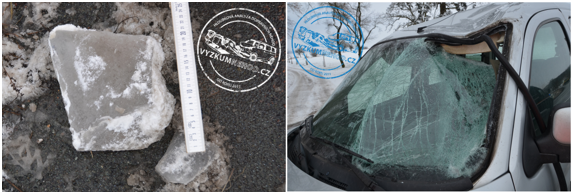 Ukázku možných následků pádu ledu ze střechy návěsu nákladního vozidla na osobní vozidlo ilustruje příklad dopravní nehody šetřené v rámci Hloubkové analýzy dopravních nehod (www.vyzkumnehod.cz). V tomto případě došlo při průjezdu nákladního vozidla Volvo směrovým obloukem k pádu většího kusu ledu na osobní vozidlo jedoucího za nákladním vozidlem. Padající kus ledu dopadl na levý přední roh střechy osobního vozidla, přičemž došlo ke zborcení střechy a proražení čelního skla. Část ledu pronikla do interiéru vozidla, došlo k lehkému zranění řidiče osobního vozidla, zejména v oblasti obličeje.